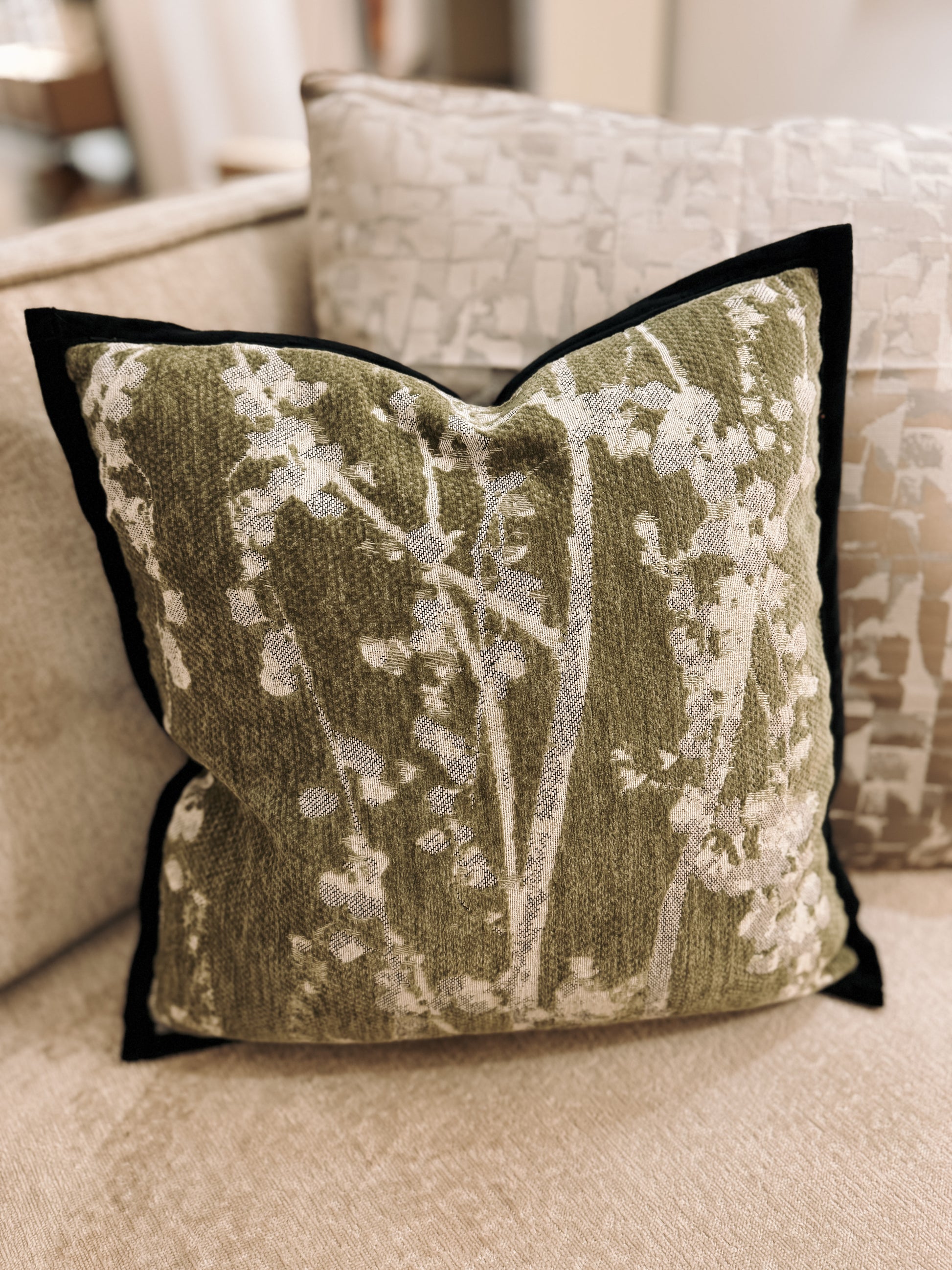 Botanical Weave Cushion, a 45x45cm statement piece designed to bring depth and organic elegance to your home. Featuring an intricate textured botanical pattern in earthy green tones with a bold black velvet trim, this cushion is the perfect blend of modern design and timeless style.
