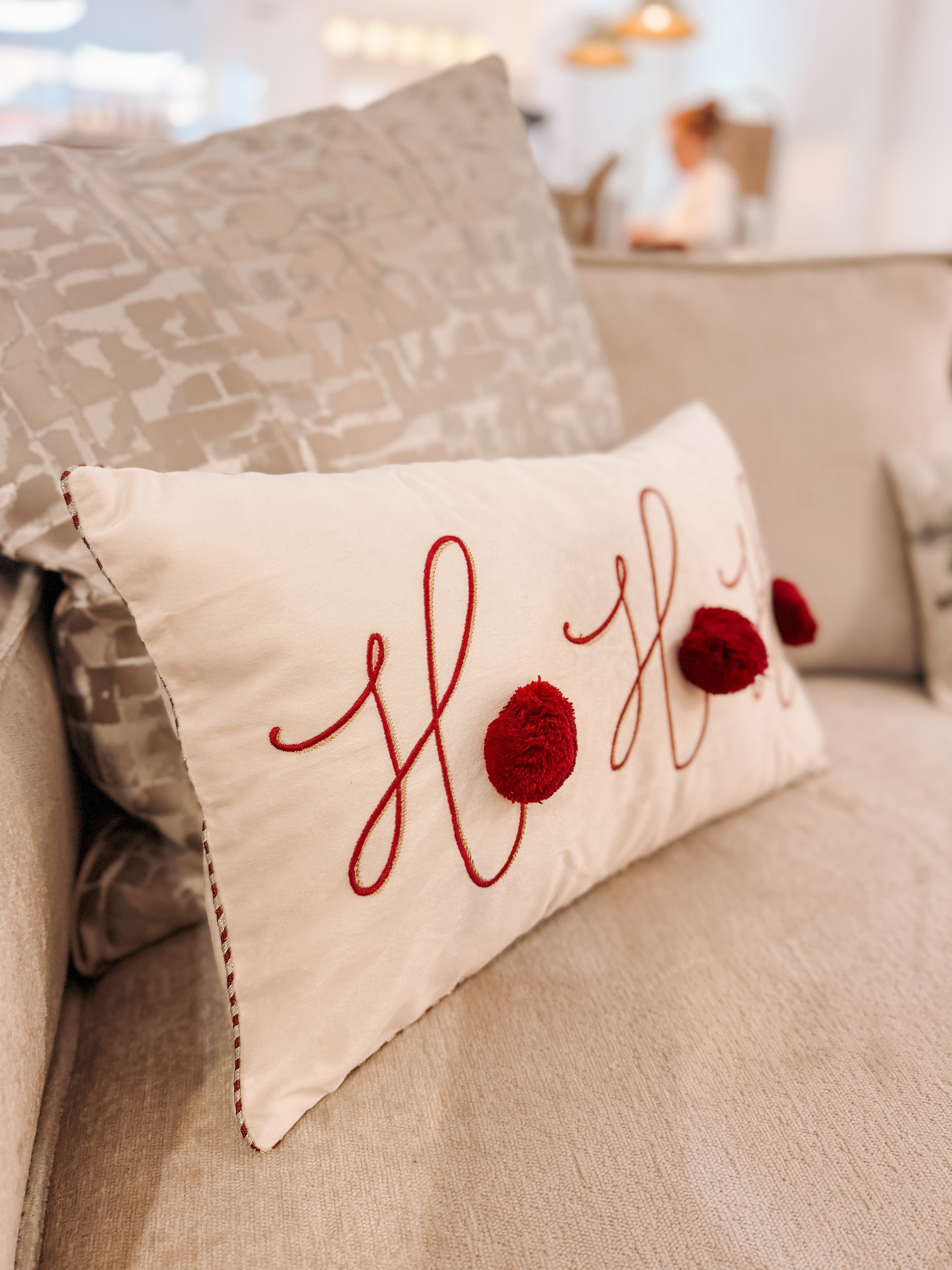 Add a playful pop of Christmas cheer to your space with our Ho Ho Ho Pom Pom Cushion. Featuring hand-stitched red embroidery and soft pom pom accents, this rectangular cushion is festive, fun, and full of personality.