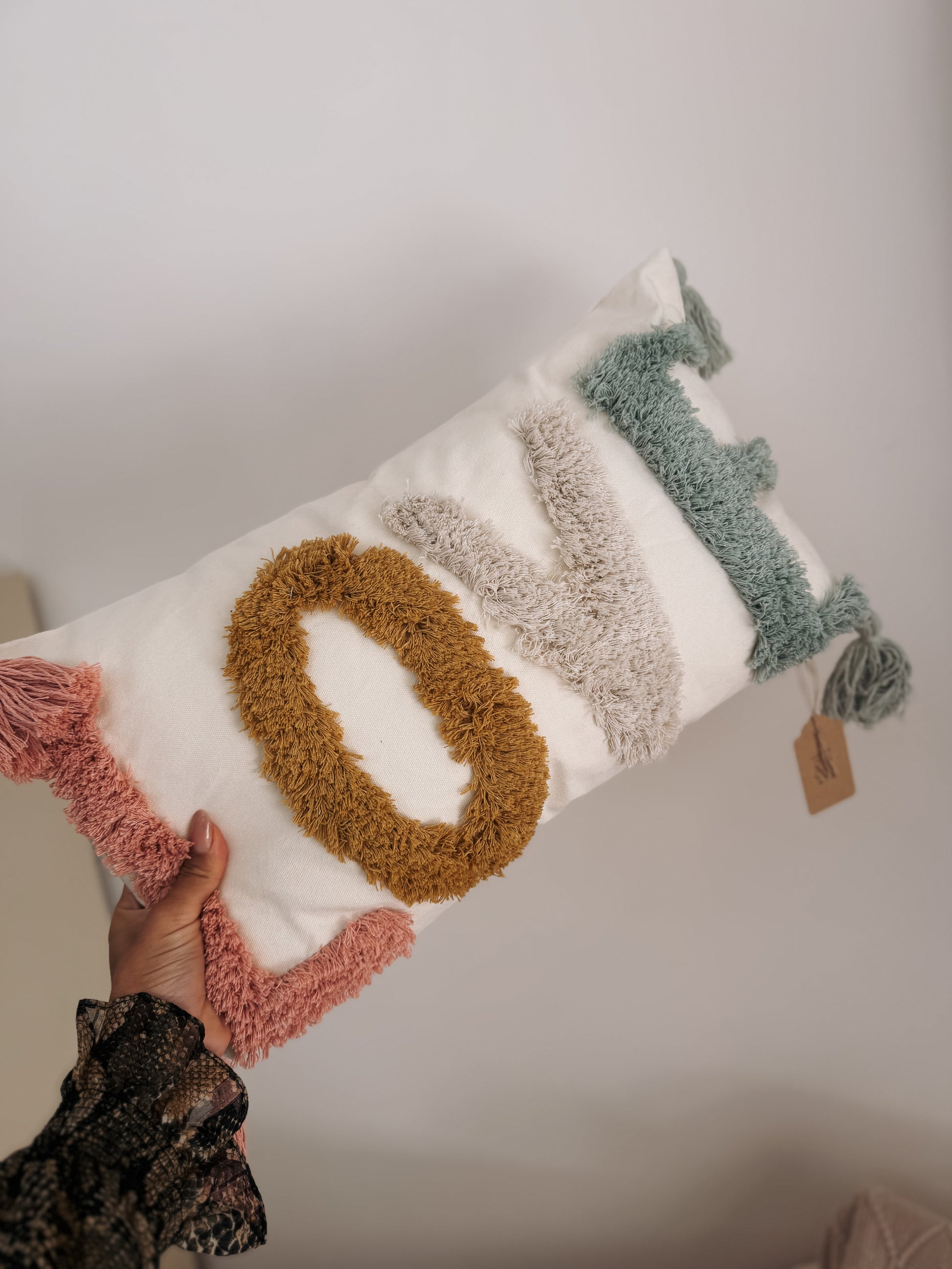 Set on a crisp neutral base, this rectangular cushion features bold tufted lettering spelling “LOVE” in a curated palette of soft pink, warm ochre, natural beige, and muted sage green. The raised texture adds depth and interest, making it a standout piece while still blending effortlessly with neutral and modern Mediterranean interiors.
