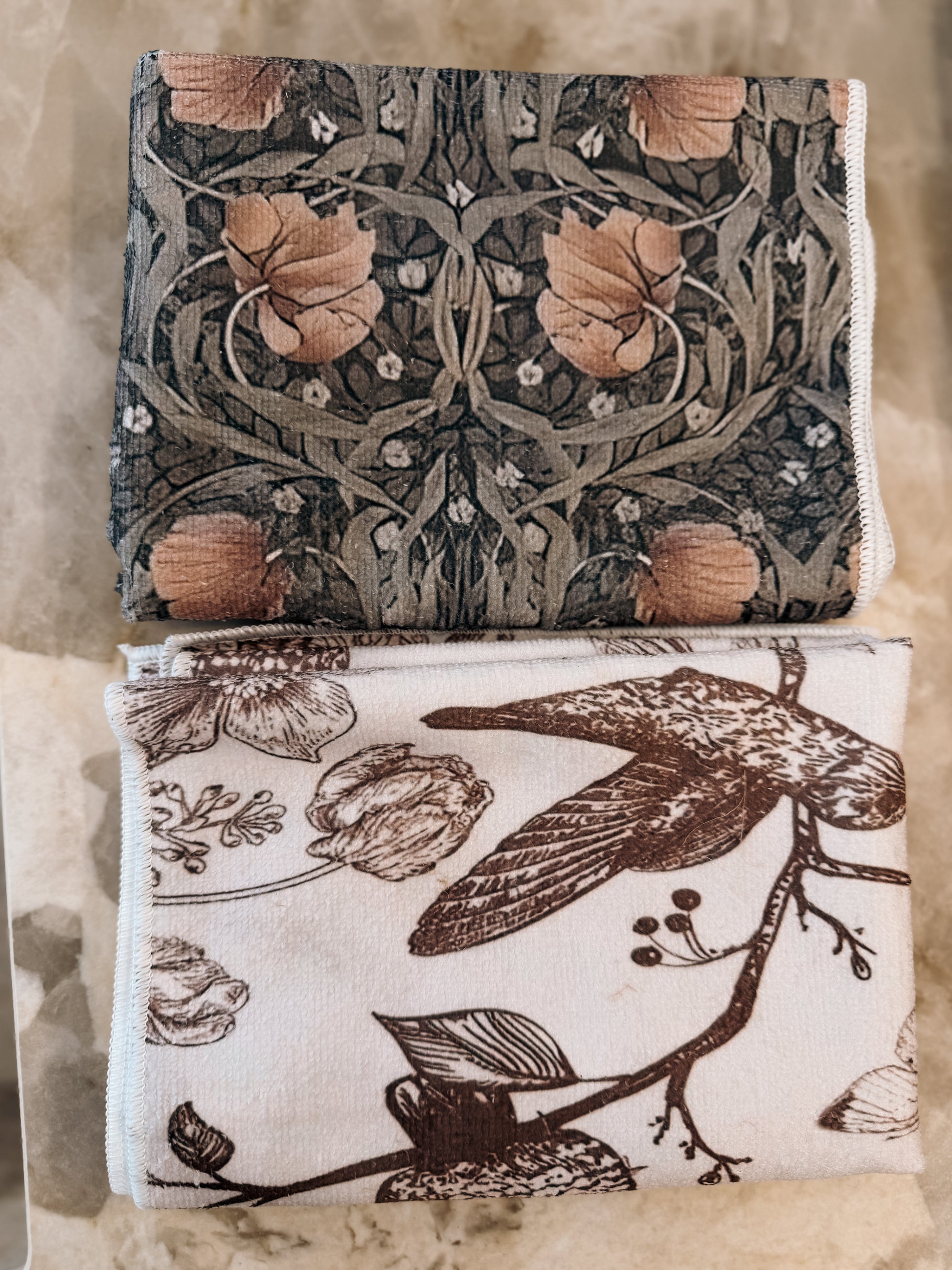 One towel showcases a soft ivory base with hand-drawn bird and branch illustrations in warm brown tones, while the second features a darker, moody botanical pattern with muted florals and foliage. Together, they create a beautifully balanced pairing that feels both classic and contemporary.
